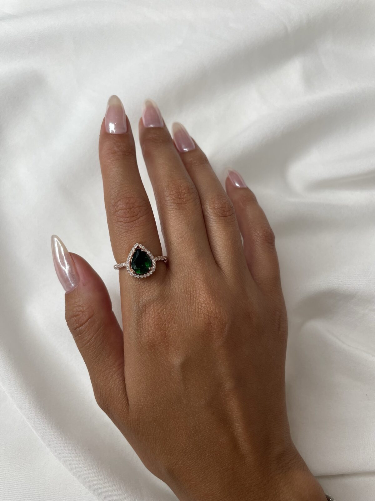 עשויה כסף אמיתי 925, ציפוי רוזגולד 14K, אבן חן סברובסקי ירוקה מרכזית ושיבוץ אבני CZ.