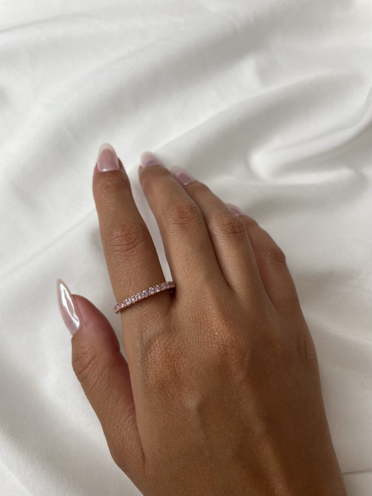 עשויה כסף אמיתי 925, ציפוי רוזגולד 14K, משובצת אבני זירקוניה ורודות בגודל של כ-2 מ"מ כל אחת.