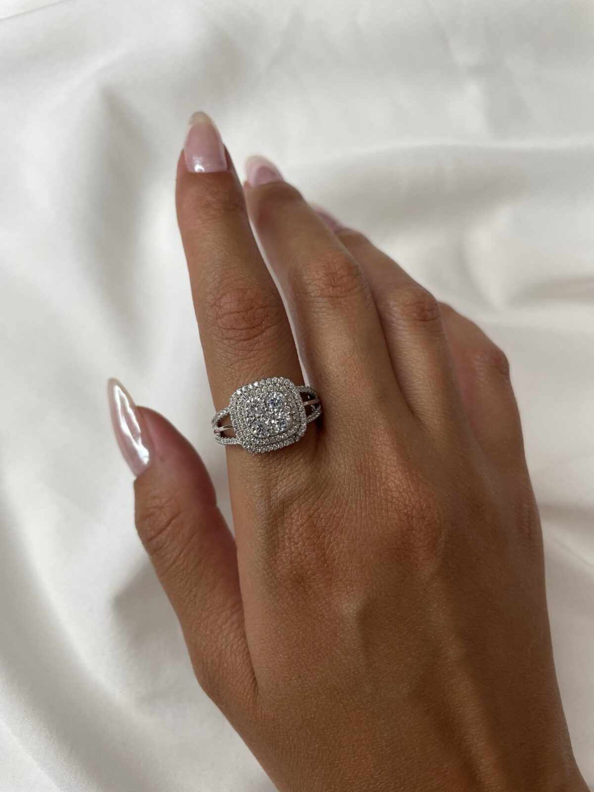 עשויה כסף אמיתי 925, ריבוע משובץ אבני CZ בגדלים שונים ומשני צידי הטבעת.