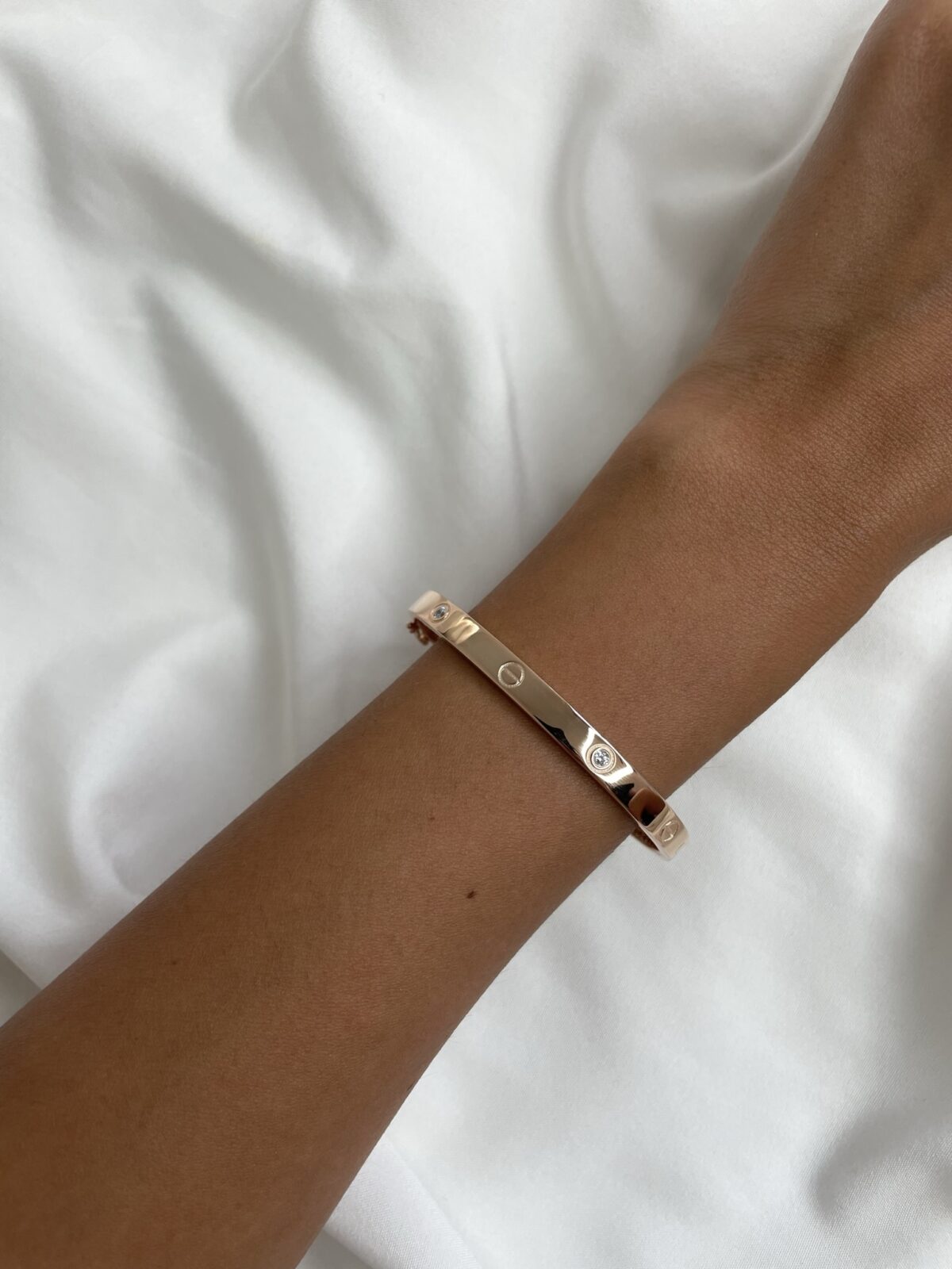 עשוי כסף אמיתי 925, ציפוי רוזגולד 14K, חלק ברובו ומשובץ ב-4 אבני זירקוניה, סוגר בטיחות.