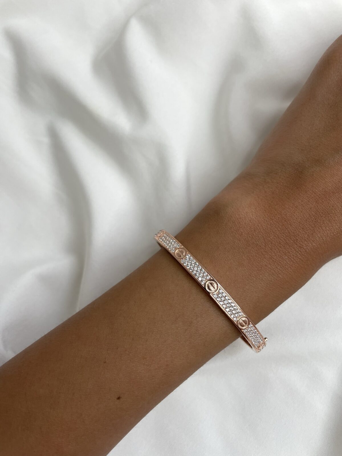 עשוי כסף אמיתי 925, ציפוי רוזגולד 14K, שיבוץ מלא באבני זירקוניה, סוגר ביטחון.