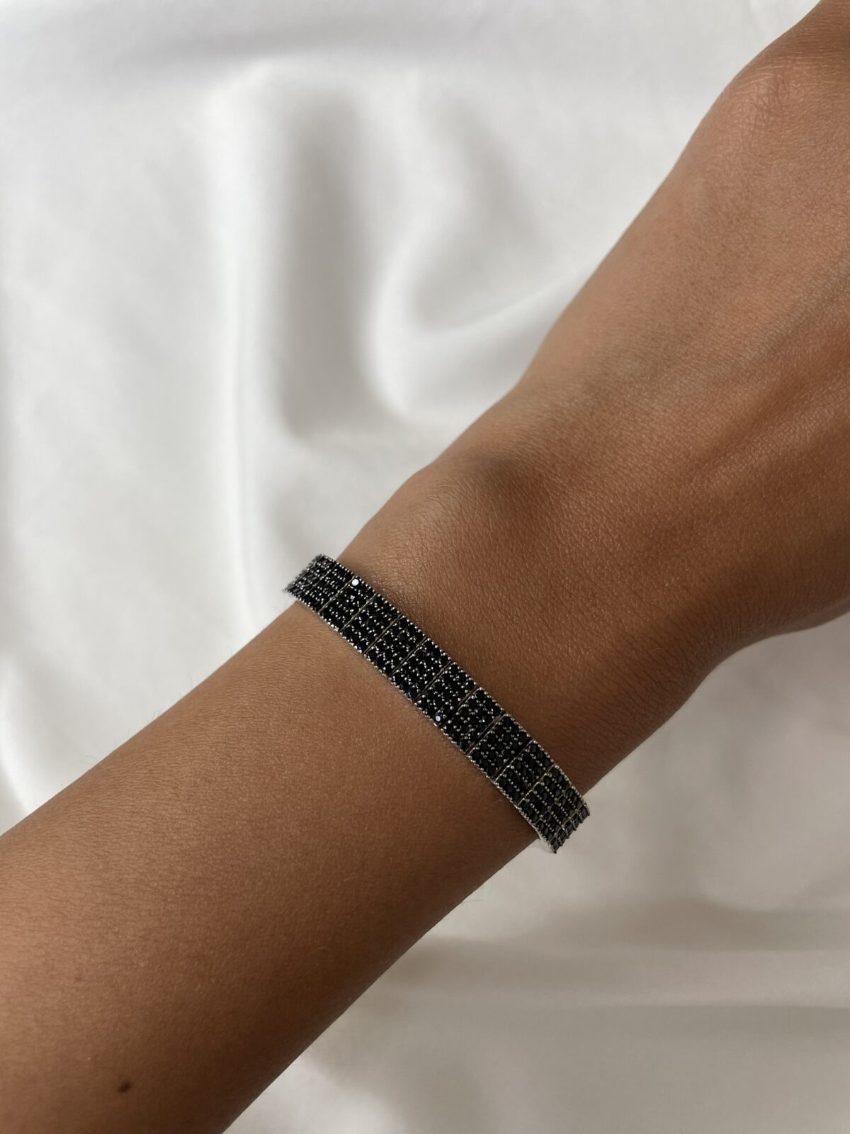 עשוי כסף אמיתי 925, שיבוץ 5 שורות אבני זירקוניה שחורות.