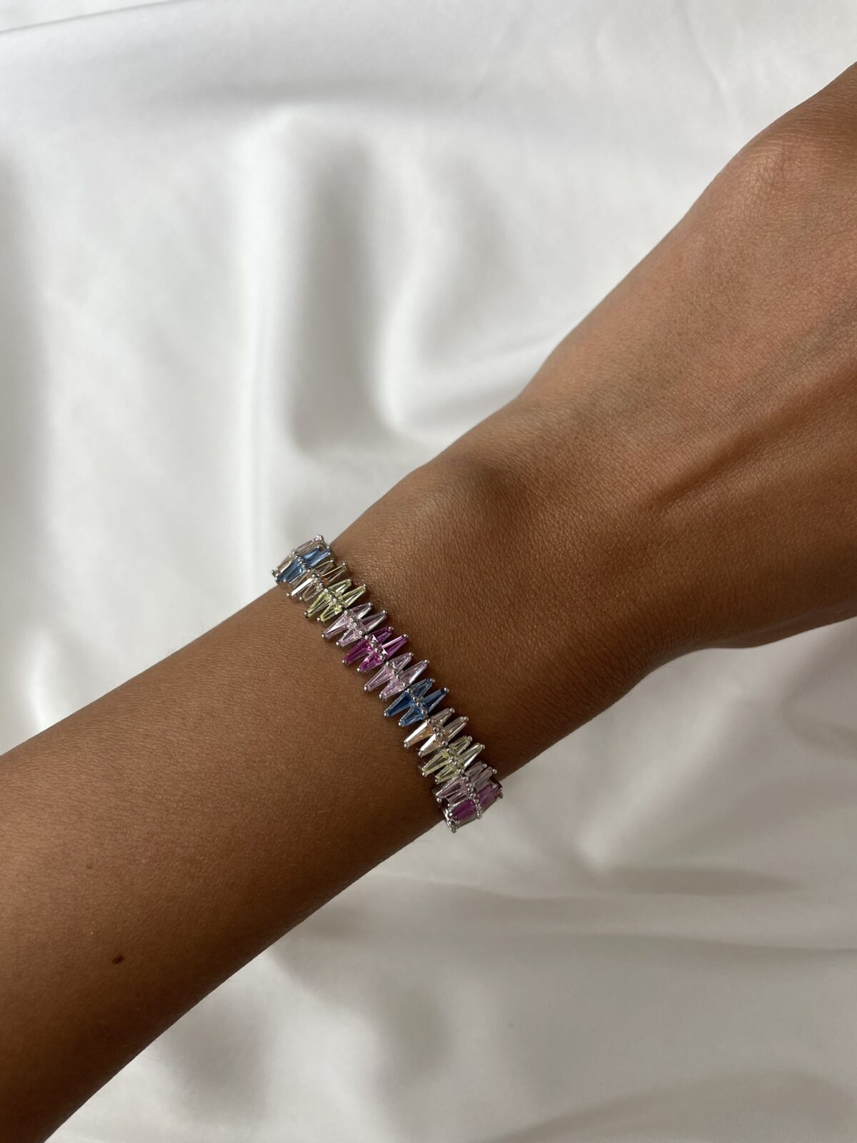 עשוי כסף אמיתי 925, מורכב לכל אורכו מאבני זירקוניה צבעוניות.