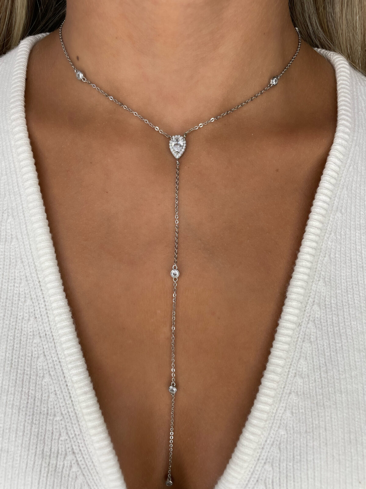 עשויה כסף אמיתי 925, שרשרת עניבה משולבת תליון טיפה משובץ אבני CZ ולאורכה אבני זירקוניה עדינות.