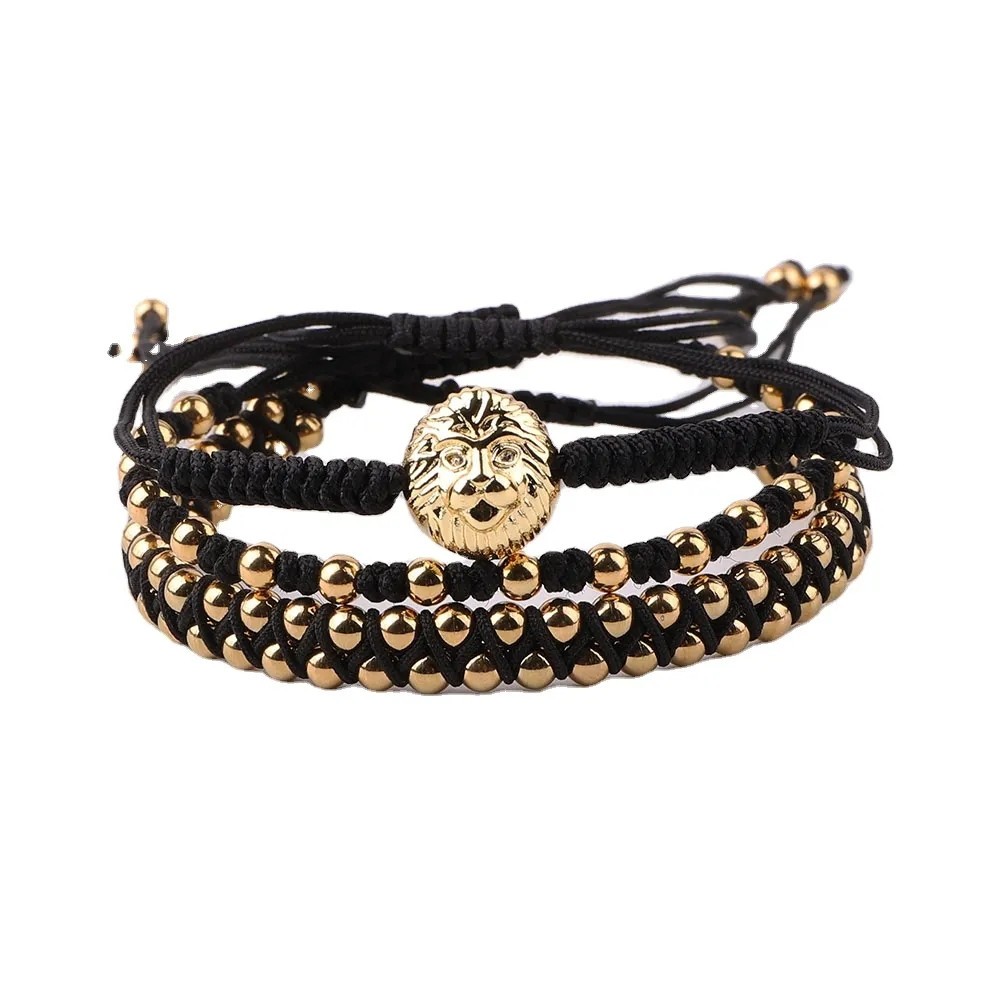 צמיד 3 שכבות מקרמה עשוי בעבודת יד ומשולב חרוזי פלדת אל חלד (סטייניסטיל) בציפוי זהב צהוב.